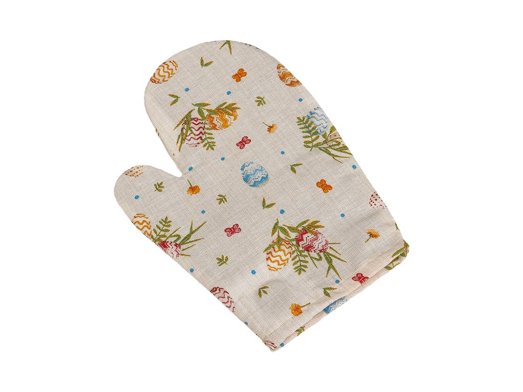 Kuchyňský chňapka je nepostradateným doplňkem pro každou hospodyňku. Je ušita z dostatečně silného materiálu ( výplň tvoří netkaná textilie), díky čemuž se zabrání zbytečnému popálení. Navíc je chňapka opatřena praktickým magnetem a poutkem pro zavěšení. Ve stejném velikonočním designu je možné objednat i ubrus na stůl nebo povlak na polštářek 45x44 cm.