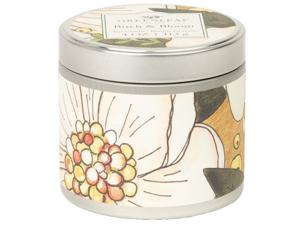 Vonná svíčka v plechové dóze Birch & Bloom je součástí kolekce Birch & Bloom oblíbené značky Greenleaf