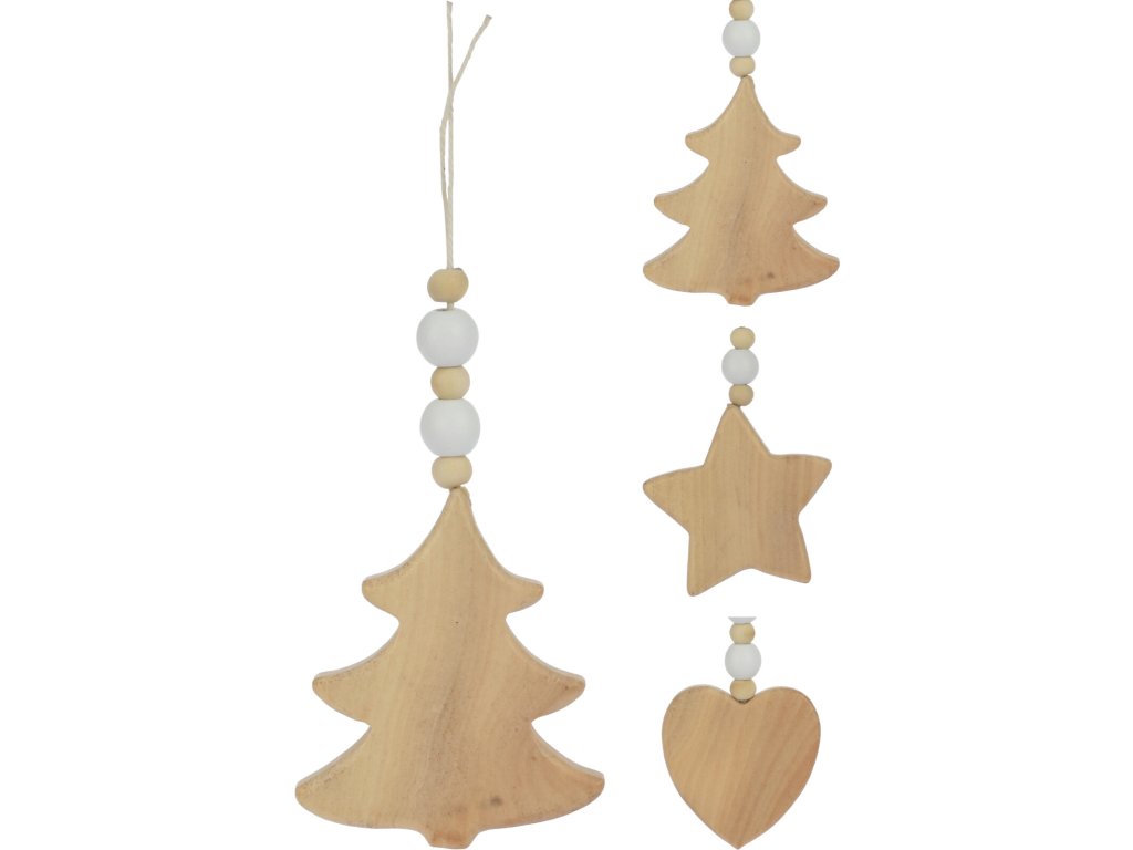 Každá figurka - strom, srdce a hvězda, má velikost kolem 6 cm a je zdobená bílými a dřevěnými korálky. Tím vytváří originální a atraktivní vzhled, který dodá vaší vánoční výzdobě zvláštní šmrnc.