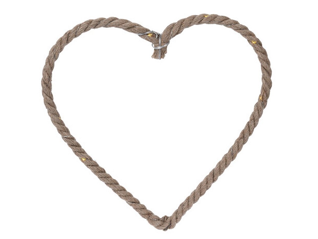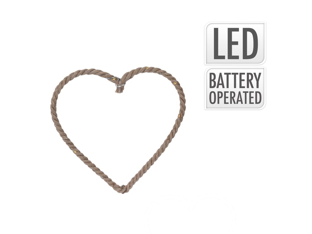 Dekorace ve tvaru srdce s kovovou konstrucí potažená jutovým lanem s 15 led žárovičkami na baterie.