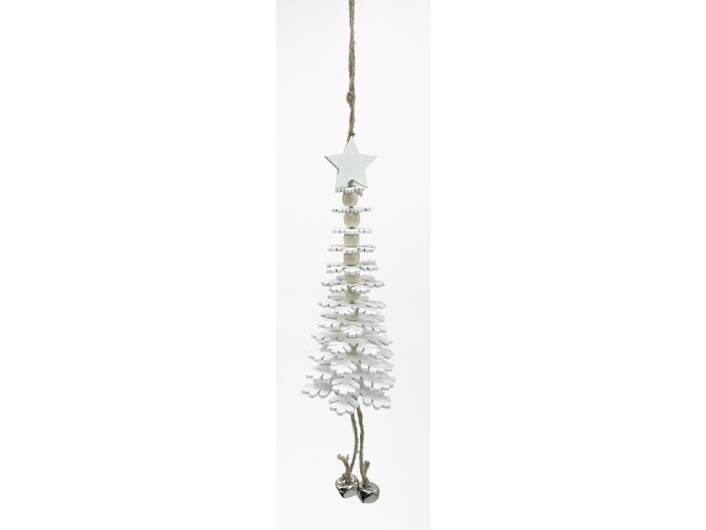 Dřevěný stromek k zavěšení, 12 pater. Na konci závěsné dekorace dvě stříbrné rolničky. Rolničky, rolničky, kdo pak vám dal hlas!!!
